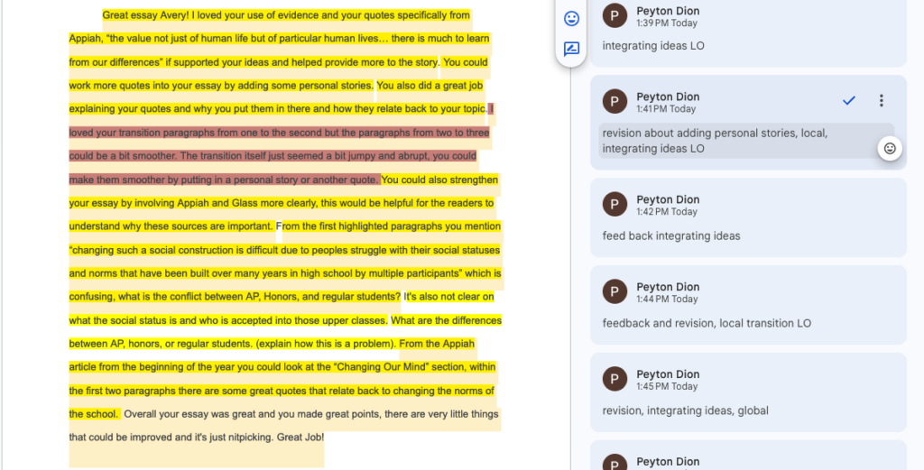 I have made progress with learning outcome four because I have been “able to critique their own and others’ work by emphasizing global revision early in the writing process and local revision later in the process.” For example, I gave Avery feedback and revision suggestions on her second essay. I went through the essay sentence by sentence deciding what learning outcomes they would be, and if they were feedback or revisions. The yellow highlights focuses on the integrating ideas learning outcome and global revisions, while the red focuses on the transitions between paragraphs and local revisions.